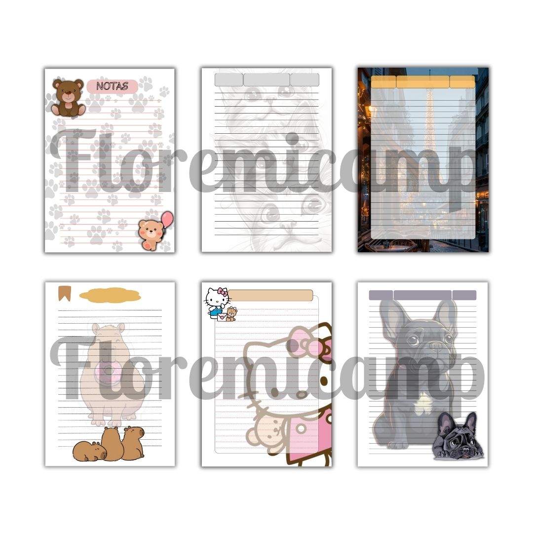 Un pack digital de 6 hojas rayadas A5 con diseños únicos y divertidos, perfectas para imprimir tantas veces como desees. ¡Organiza tus notas con estilo y creatividad!